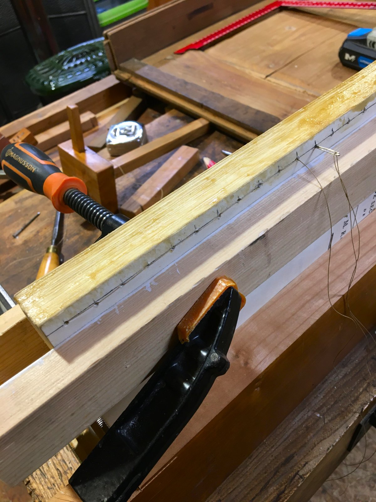 Pour le collage le local doit être bien chauffé et on chauffe les pièces de bois, personnellement j'utilise un décapeur thermique ou mon petit poêle à bois.
