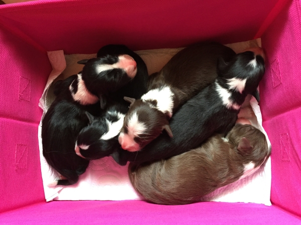 3 mâles et deux femelles (1 brune et 1 noire). Baxter est resté chez nous !C'est lui au milieu, il vient de naître.