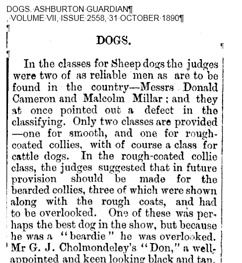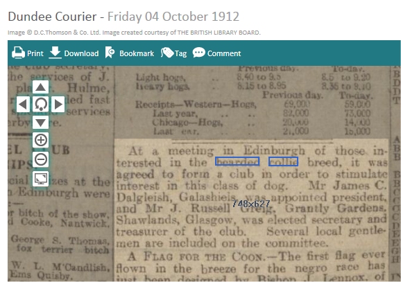 On y trouve par exemple la trace de la création d'un premier club de race en 1912. Ci-dessus dans le « Dundee courier » du 4 octobre 1912, article annonçant la création d'un Club du Bearded Collie.