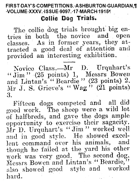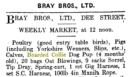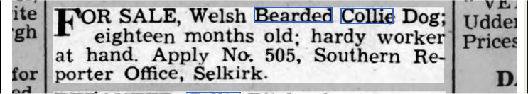 Southern Reporter du 8 octobre 1942 : "A vendre, Bearded Collie mâle du Pays de Galles ; âgé de 18 mois ; Travailleur robuste disponible. Adressez-vous au N° 505, Agence du Southern Reporter, Selkirk."
