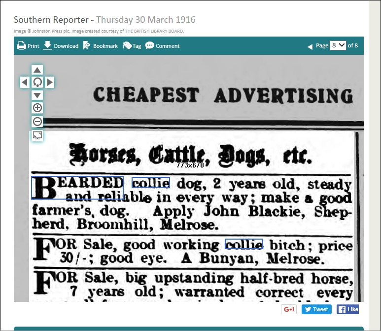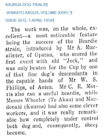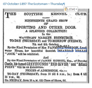 Deux sites sont particulièrement intéressants : " The British Newspaper Archive " qui donne accès à plus de 40 millions de pages des anciens journaux britanniques qui ont été digitalisées, ainsi que " Papers Past " l'équivalent en Nouvelle Zélande. Il faut savoir que de nombreux Bearded collies ont été exportés au 19ème siècle pour garder les troupeaux en Nouvelle Zélande et en Australie.