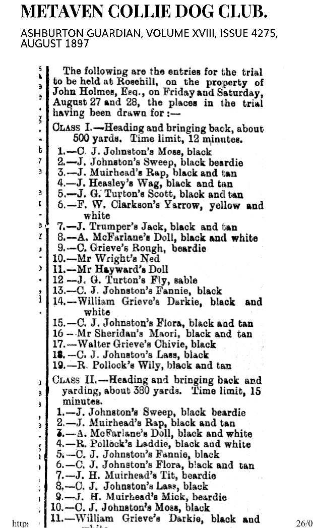 On constate ici qu'en 1897 les Beardies étaient capables de rivaliser avec les autres chiens de troupeau dans les concours, mais aussi qu'aucune autre race n'est citée nommément. En Classe 1 il sagit de chercher des moutons à 500 yards et de les ramener en 12 minutes maximum.