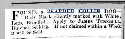Southern Reporter du 10 septembre 1868 : "Trouvé, un Bearded Collie mâle - Corps noir, légèrement marqué de blanc, pattes mouchetées. Adressez-vous à James Turnbull, Boucher, Selkirk. S'il n'est pas réclamé dans la semaine il sera vendu."