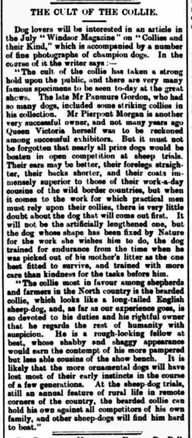 « Lors d'une rencontre à Edimbourg des amateurs de l'élevage du Bearded Collie, il a été approuvé de créer un Club destiné à stimuler l'intérêt pour cette classe de chiens. Mr C. Dalgleish, Galashields, fut élu Président et Mr J. Russel Gleig, Grantly Gardens, Glasgow, fut élu secrétaire et trésorier du Club. Plusieurs « gentlemen » locaux font partie du Comité. »
