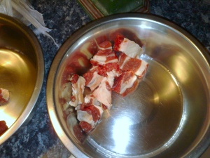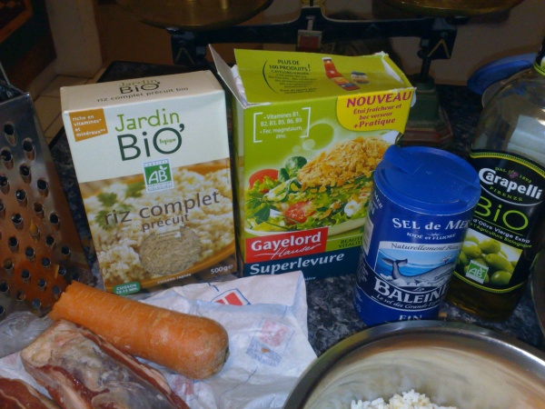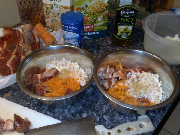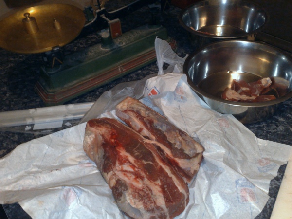 La viande c'est du plat de côte de boeuf, achetée en gros avec os. Les os sont également servis de temps en temps, crus bien sûr, pour des séances de grignotage sur le gazon (très bon pour les dents, la tête, le métabolisme, ...)